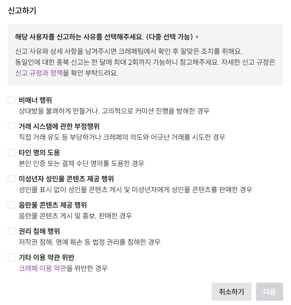 To ensure a safe commission experience for all users, CREPE implements policies to protect users and handles reports in accordance with Article 9 of the Terms of Service.