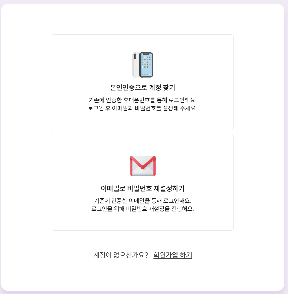 - 해당 계정에서 최근 1년 이내 휴대폰 본인 인증을 진행한 경우, [로그인 > 로그인에 어려움이 있으신가요? > 본인인증으로 계정 찾기]에서 본인 인증으로 로그인할 수 있어요.