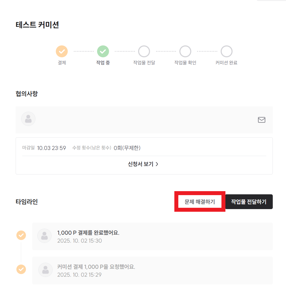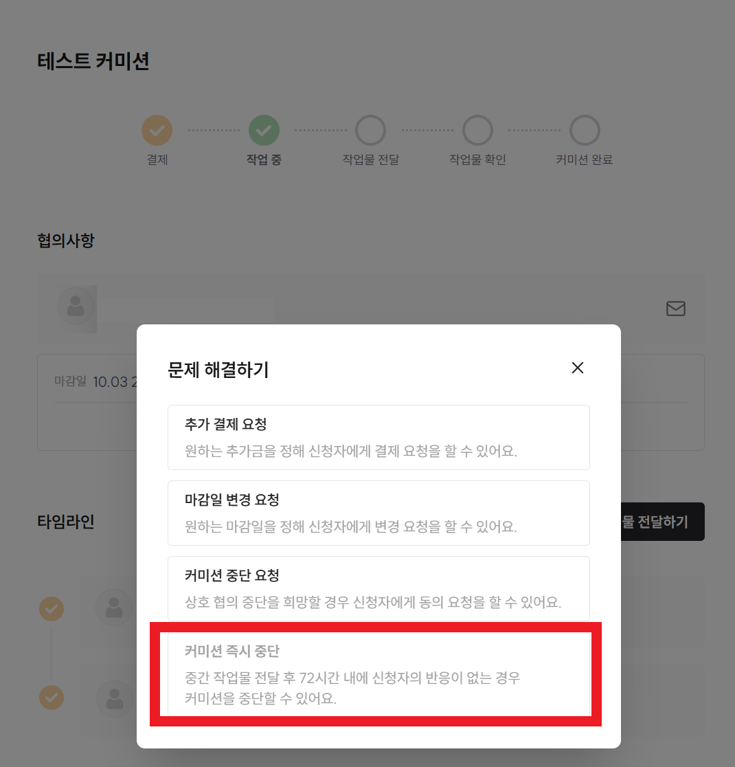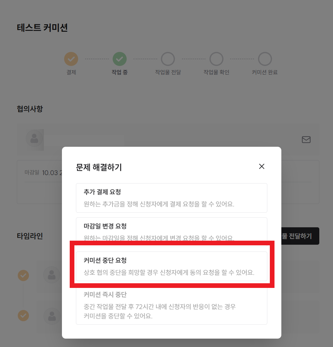 커미션주는 ‘문제 해결하기’ 내 ‘커미션 중단 요청’ 버튼을 눌러 신청자에게 해당 커미션 건 중단을 요청할 수 있어요. 신청자는 커미션 중단 요청 알림을 받고 24시간 안에 동의하거나 거절할 수 있어요.