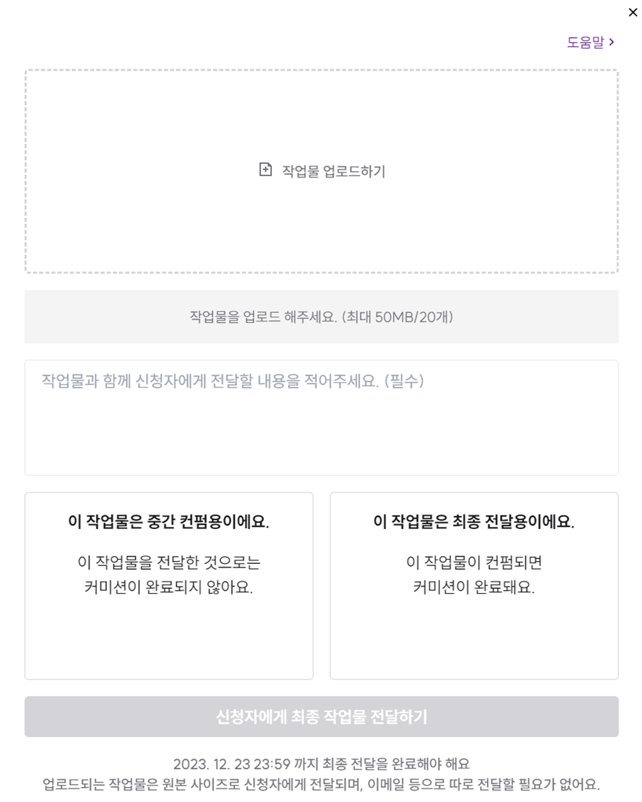- 최종 작업물에는 신청자가 별도로 코멘트를 전달할 수 없어요.