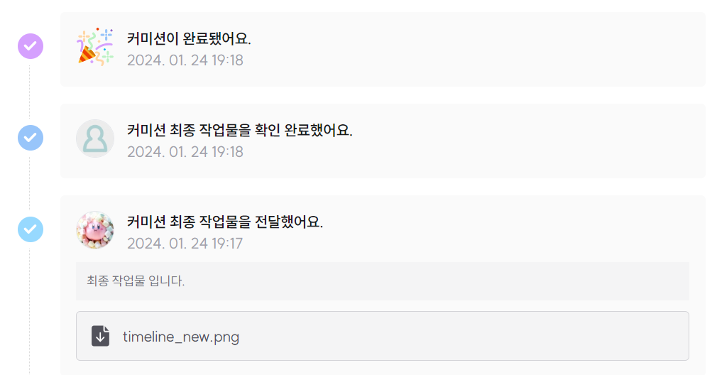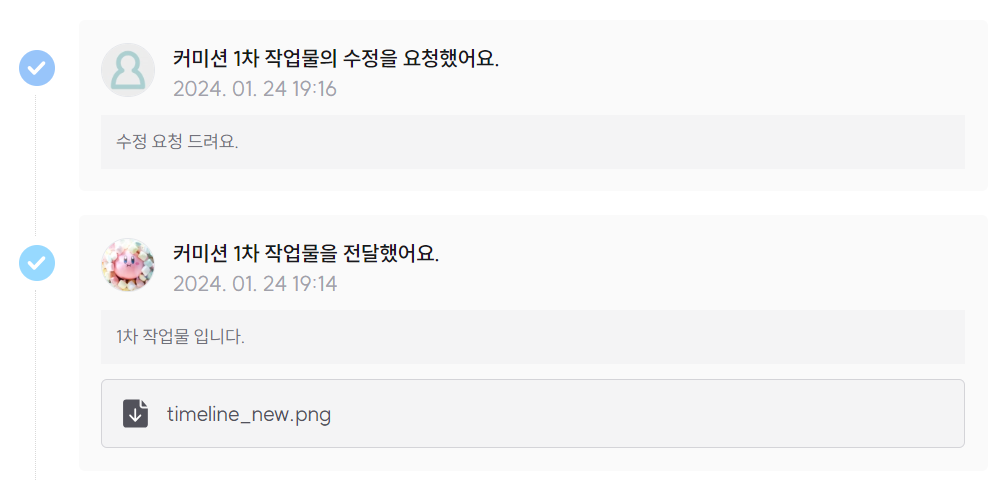 커미션 진행 페이지에서 중간 확인용 및 최종 작업물을 전달할 수 있어요.