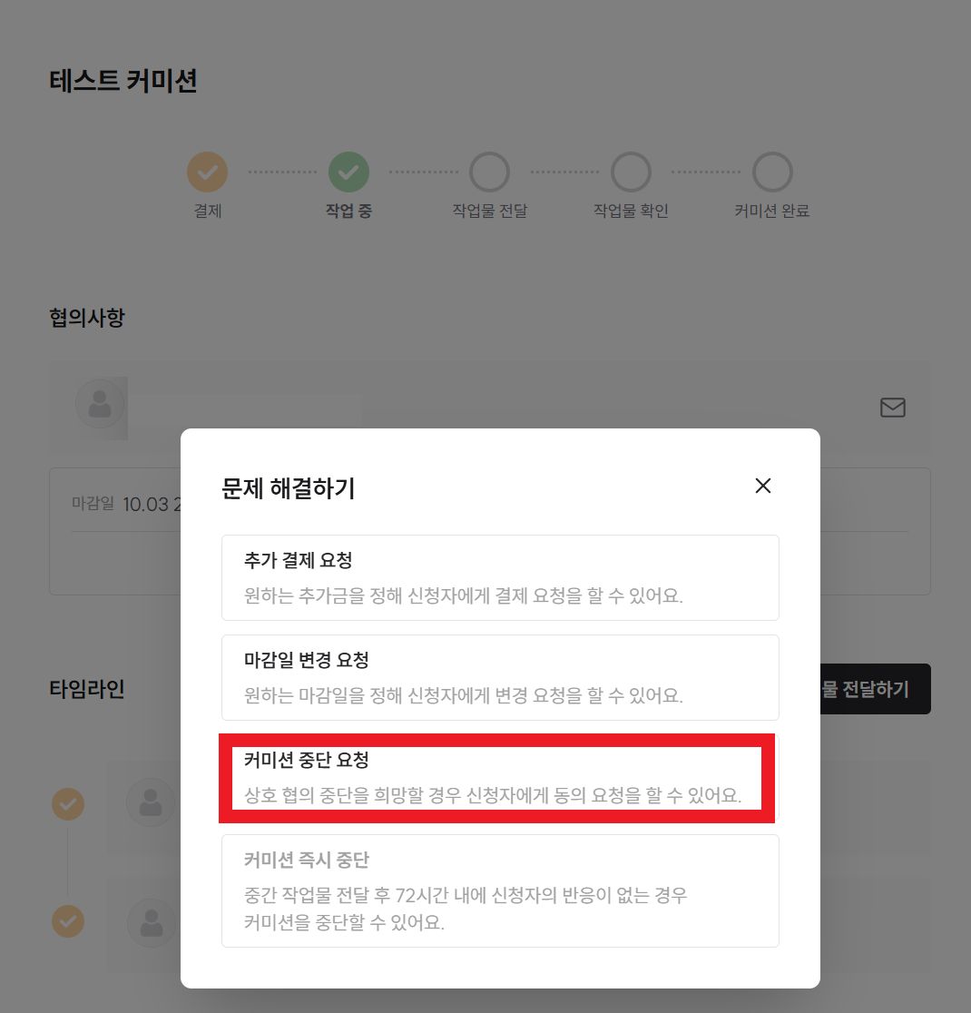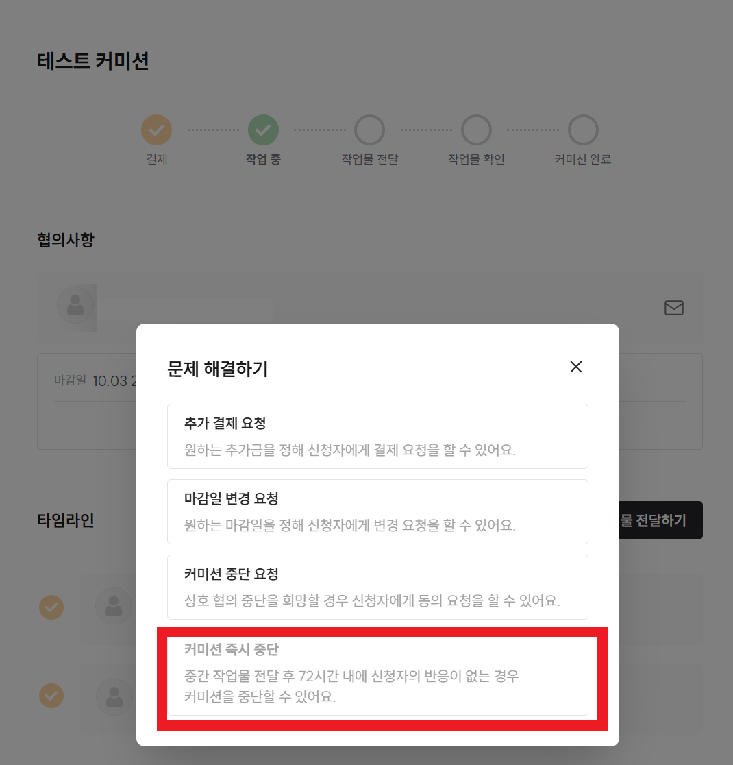 해당 버튼을 눌러 나오는 문제 해결하기 리스트에서 '커미션 즉시 중단' 버튼을 누르면 커미션을 중단할 수 있어요.